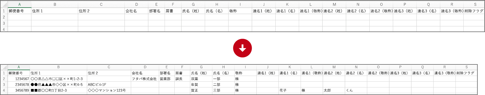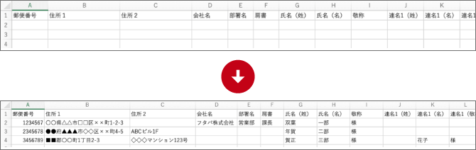 - 2ダウンロードしたファイルに宛名情報を入力し宛名ファイルを作成・保存します